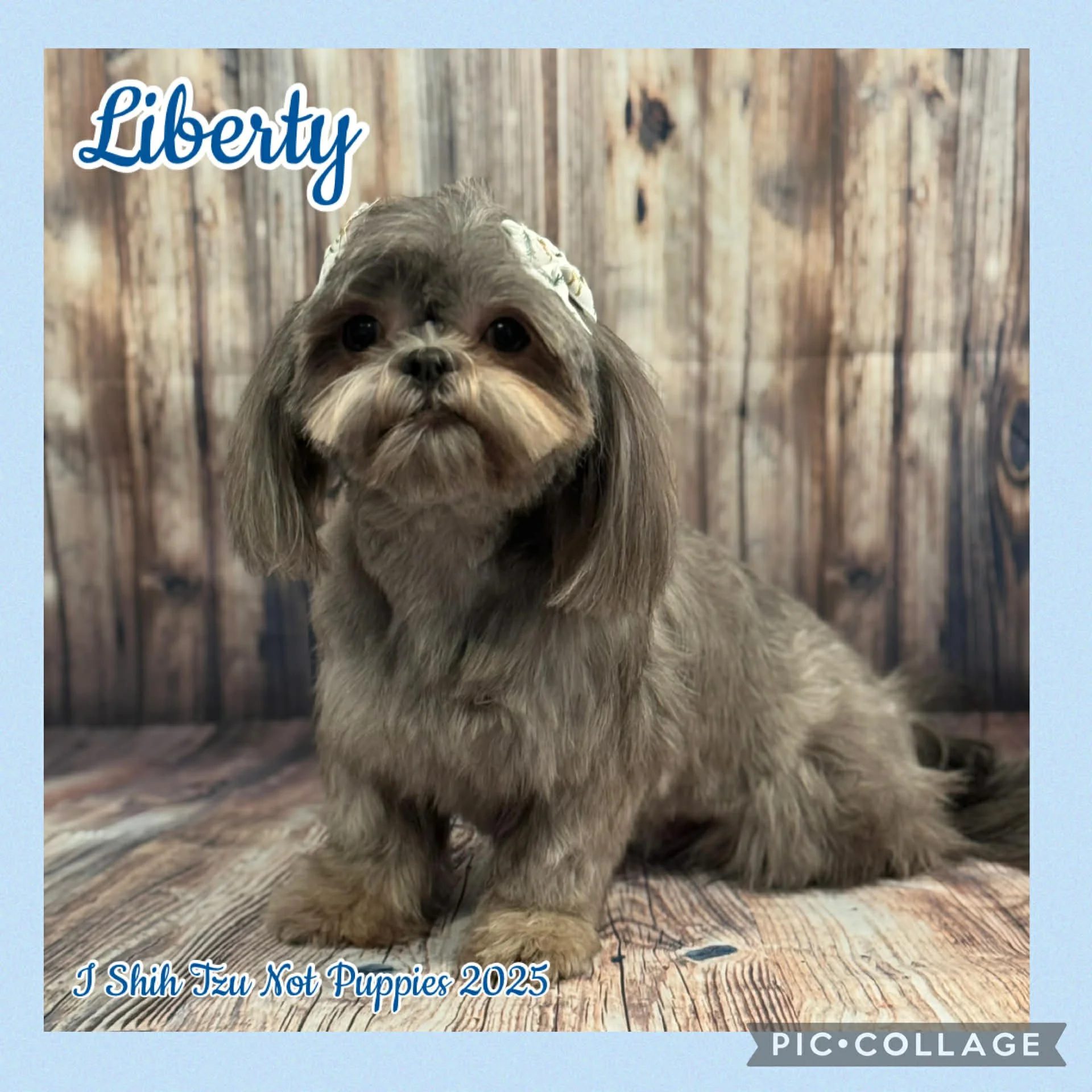 Liberty or Libby for short is our sweet blue shih tzu. She has a very sweet personality and dances when we say her name or talk about treats. She loves to play with Bee and Stella and she loves treats. Liberty is 10 pounds and had a beautiful litter with Lincoln that included 2 blue boys, a liver boy and a lavender girl. We are hoping for more blues or lavenders in January of 2026.